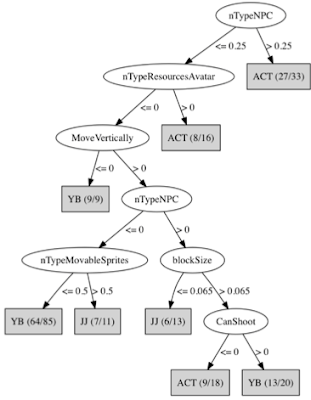 そんなわけで私は同僚と、ハイパーヒューリスティクスをビデオゲーム(具体的にはGVG-AIフレームワークのビデオゲーム)にどうやって適用させればいいかの調査を開始しました。その最初の成果が、この9月に開かれたIEEE Conference on Computational Intelligence and Gamesで発表した論文です。 こちらでご覧になれます。 エージェントに簡単に利用できるシンプルなフィーチャを使うことで、複数あるアルゴリズムのどれが、初めてのゲームに一番適しているかを比較的高い精度で予測できることを示しています。私たちは2014年および2015年のGVG-AIコンペティションでベストの結果を出したいくつかのエージェントを元にして、あるエージェントを作りました。そして、未訓練の状態において、どれが他よりも優れたエージェントで、それぞれの新しいゲームに対してどれを使うかを巧みに選ぶことによって、その効果を実証しました。このエージェントの中心にある分類器はシンプルな決定木なので、エージェントが選ばれる時の基準を検証することもできます。